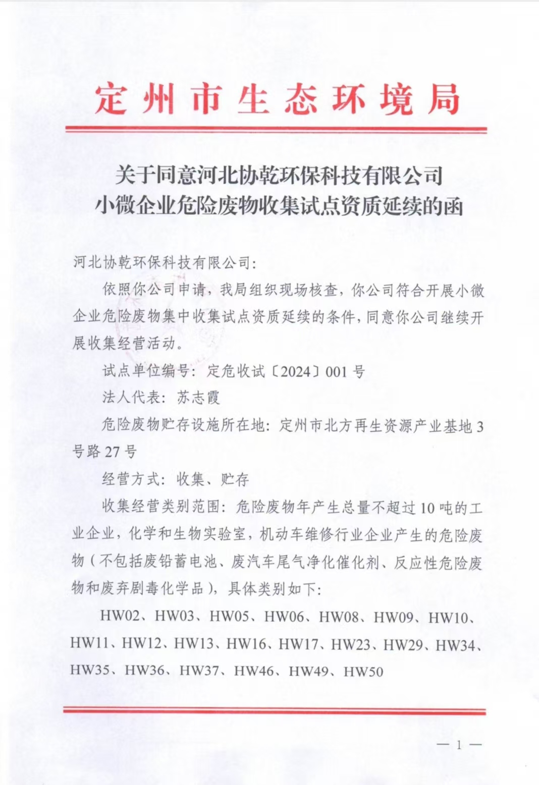 关于同意河北协乾环保科技有限公司小微企业危险废物收集试点资质延续的函
