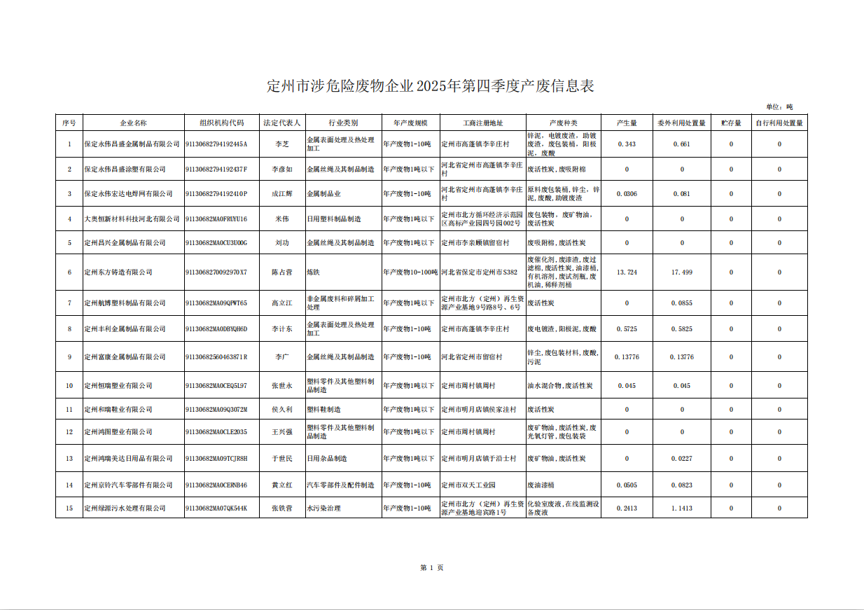 定州市涉危险废物企业2025年第四季度产废信息表
