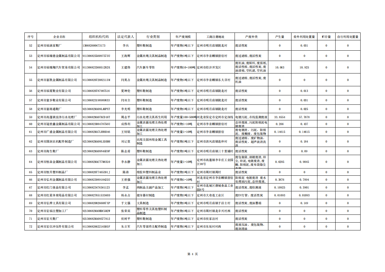 定州市涉危险废物企业2025年第四季度产废信息表