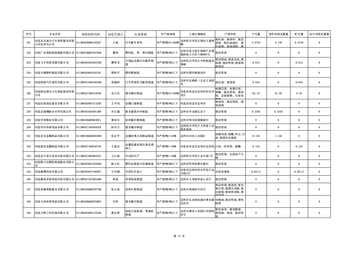 定州市涉危险废物企业2026年第一季度产废信息表