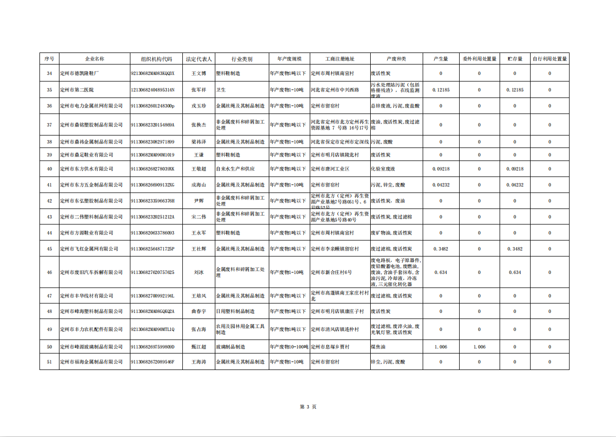 定州市涉危险废物企业2026年第一季度产废信息表
